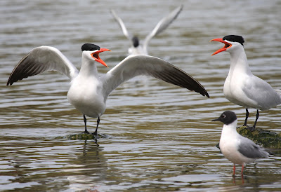 This little Bonaparte's Gull looks like a referee near two Caspian Terns.